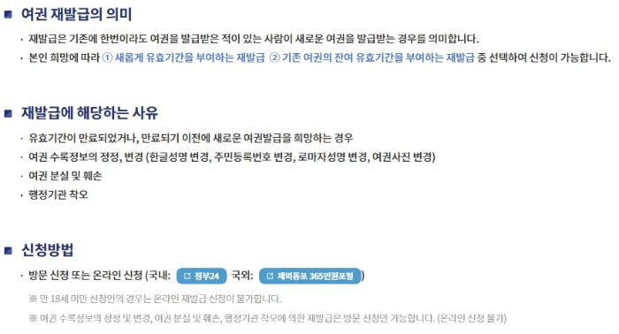 -처음 여권 발급신청인 경우 무조건 시군구청을 방문하여야 하며 재발급은 온라인 통해서도 가능합니다.